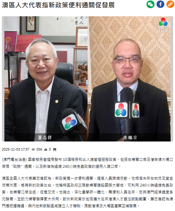 澳區全國人大代表蕭志偉認為,新政策進一步便利通關,提高人員跨境流動,他相信未來在物流及資金流等方面,將有新的政策出台。他稱特區政府正推動橫琴建設國際大學城,可利用 240小時過境免簽政策,在橫琴口岸往返,促進交流。他指出,深化產學研一體化,需便利人員往來,支持澳門經濟適度多元發展,並助力橫琴發揮更大作用。對於新政策亦包括擴大往來港澳人才簽注試點範圍,蕭志偉認為澳門應把握機遇,與內地新試點區域建立人才機制,推動港澳及大灣區產業互補發展。