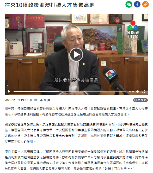 澳區全國人大代表蕭志偉:“將來這些人員往來都需要透過一個更加便利的通關,所以我相信今後這個是有利於澳門經濟適度多元發展的同時,亦都有利於橫琴在未來怎樣可以產生到更大的作用?我亦都深信今屆特區政府是可以將治理能力提升之後,今後特別在橫琴粵澳深度合作區裡面的打造過程中,亦都包括推動大灣區,我們融入國家發展大局等方面,都能夠和國家的部分(政策)可以對得上。”