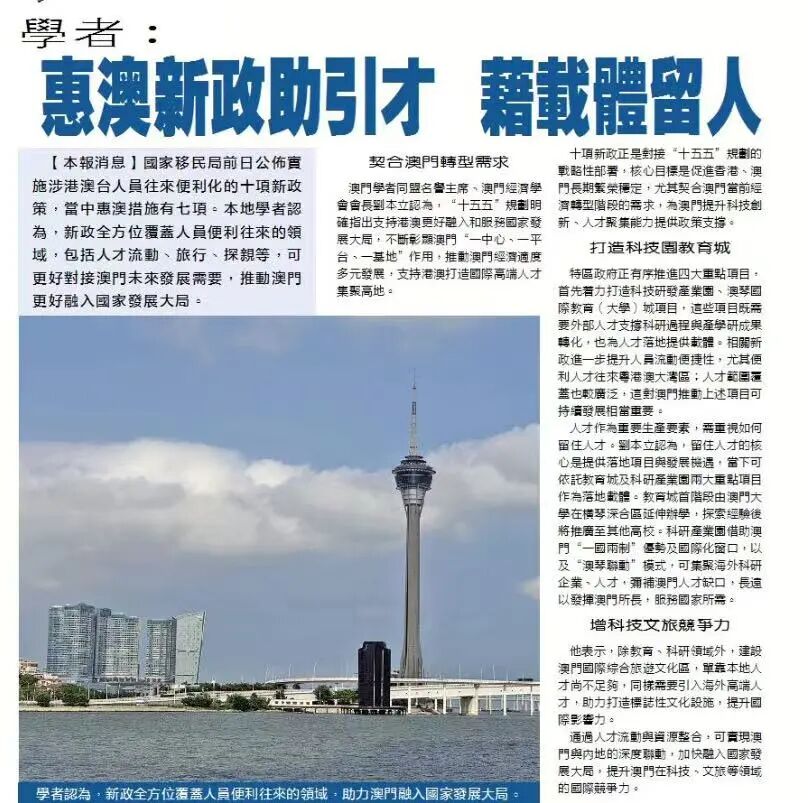 他表示,除教育、科研領域外,建設澳門國際綜合旅遊文化區,單靠本地人才尚不足夠,同樣需要引入海外高端人才,助力打造標誌性文化設施,提升國際影響力。通過人才流動與資源整合,可實現澳門與內地的深度聯動,加快融入國家發展大局,提升澳門在科技、文旅等領域的國際競爭力。