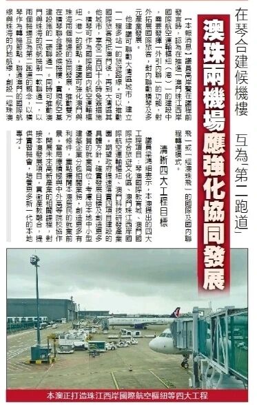 他建議可聯動大灣區城市,建立“一程多站”的旅遊路線。可以推動國際旅客飛抵澳門後,再到大灣區其他城市,享受二百四十小時免簽措施。橫琴可作為國際與國內航空運輸樞紐(港)的節點,建議可強化澳門與珠海兩個機場的協同發展,推動雙方在橫琴聯合建設候機樓,實現航空基建設施的“硬聯通”。同時可推動澳門與珠海的民航機制“軟聯通”,以兩個機場互為第二跑道的概念,以橫琴作為轉機節點,聯通澳門的國際航線與珠海的內地航線,創設“經珠澳飛”或“經澳珠飛”的國際及國內聯程轉運模式。