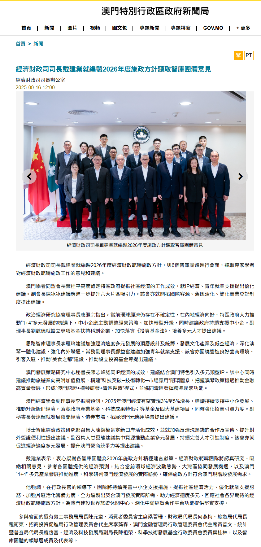 本文整理自 2025.09.16 澳門特別行政區政府新聞局