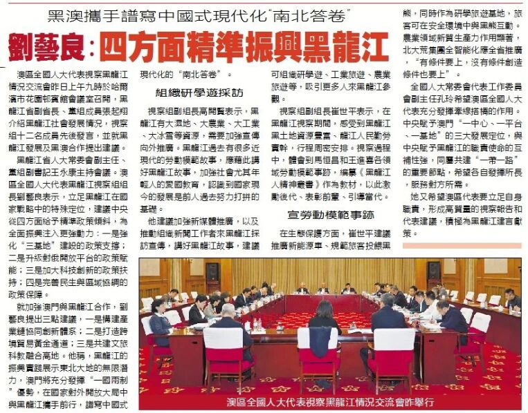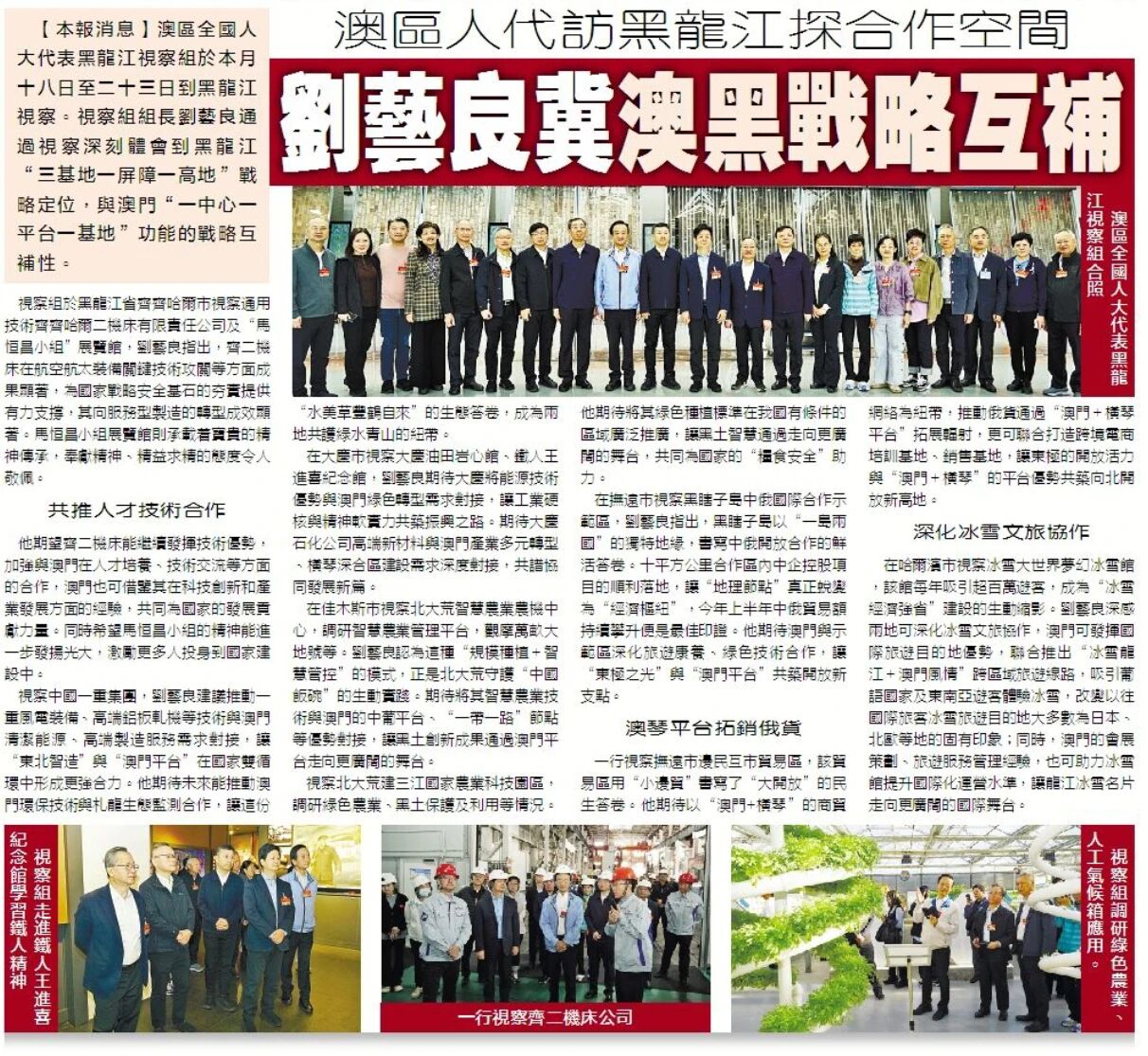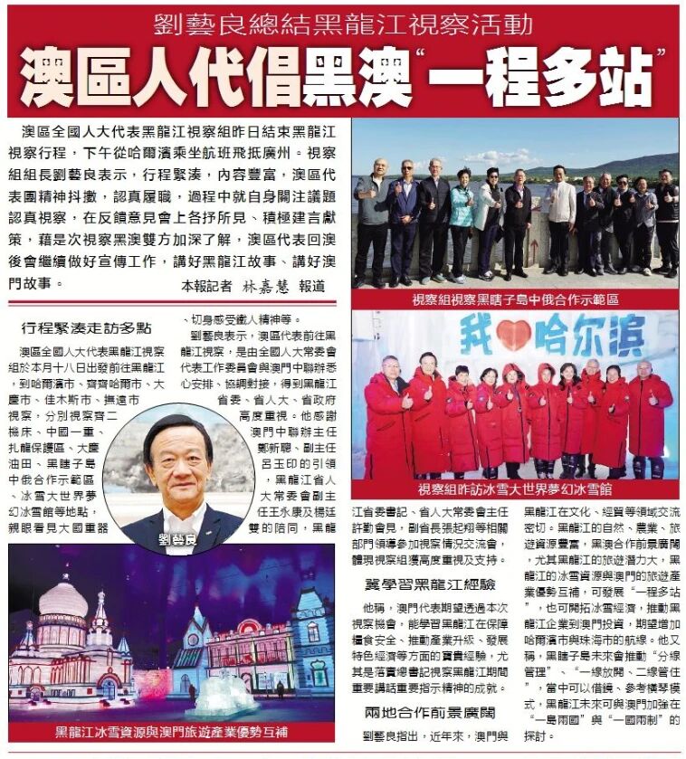 澳區全國人大代表黑龍江視察組結束黑龍江視察行程。視察組組長、澳區全國人大代表、澳門發展策略研究中心副會長劉藝良表示,澳區代表前往黑龍江視察,是由全國人大常委會代表工作委員會與澳門中聯辦悉心安排、協調對接,得到黑龍江省委、省人大、省政府高度重視。他感謝澳門中聯辦主任鄭新聰、副主任呂玉印的引領,黑龍江省人大常委會副主任王永康及楊廷雙的陪同,黑龍江省委書記、省人大常委會主任許勤會見,副省長張起翔等相關部門領導參加視察情況交流會,體現視察組獲高度重視及支持。