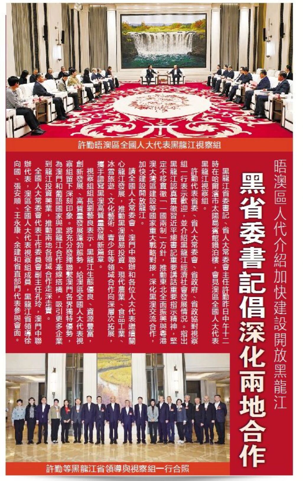 就加強澳門與黑龍江合作,劉藝良提出三點建議,一是構建產業鏈協同創新體系;二是打造跨境貿易黃金通道;三是共建文旅科教融合高地。他稱,黑龍江的振興實踐展示東北大地的無限潛力,澳門將充分發揮“一國兩制”優勢,在國家對外開放大局中與黑龍江攜手前行,譜寫中國式現代化的“南北答卷”。