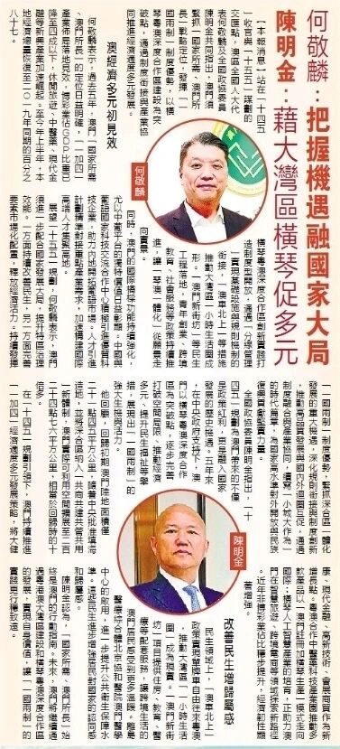 展望“十五五”規劃,何敬麟表示,澳門須進一步配合國家發展大局,提升特區治理效能。一方面持續改善民生,另一方面完善要素市場化配置,釋放經濟活力。持續發揮“一國兩制”制度優勢,緊抓深合區一體化發展的重大機遇,深化規則銜接與制度創新,推動高質量發展與國內外循環互促,通過制度融合與產業協同,續寫“小城大作為”的時代篇章,為國家高水平對外開放與民族復興貢獻堅實力量。